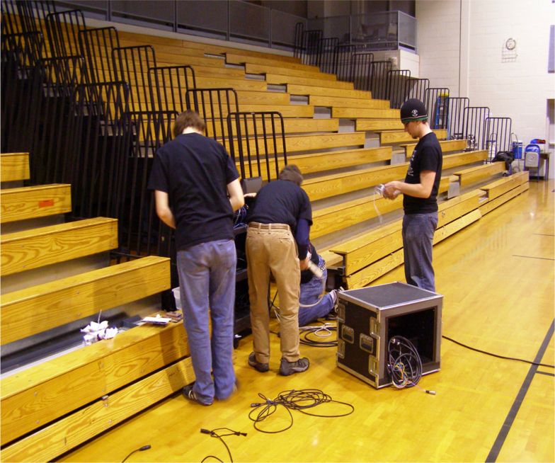 Setting up the sound console for an elementary school performance. Our venues ranged from gymnasiums to libraries.