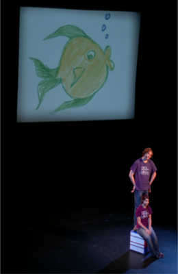 In the public performances the “set” consisted of an 18” block and a large projection screen upon which children’s illustrations appeared. The live production was closer in style to a theme park show than a traditional play or theatrical work due to its focus on sound and movement. The production included collaborative script development.