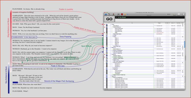 Workshop Element/Interactivity – Through the rehearsal process we identified areas in the script in which we could engage the audience. It was decided to record the audience before the performance, reading lines and doing sound effects (mouth noises), and to have some audience on stage for specific moments. Each performance included time to rehearse the audience in their stage roles. This activity provided the engineers time to process the recordings and add them to QLab.